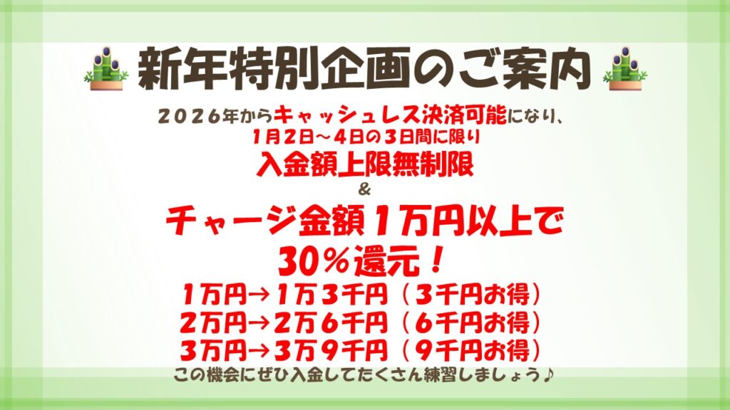 1万円チャージしていただくと通常15%お得になるのですが、1月2,3,4日の三日間に限り